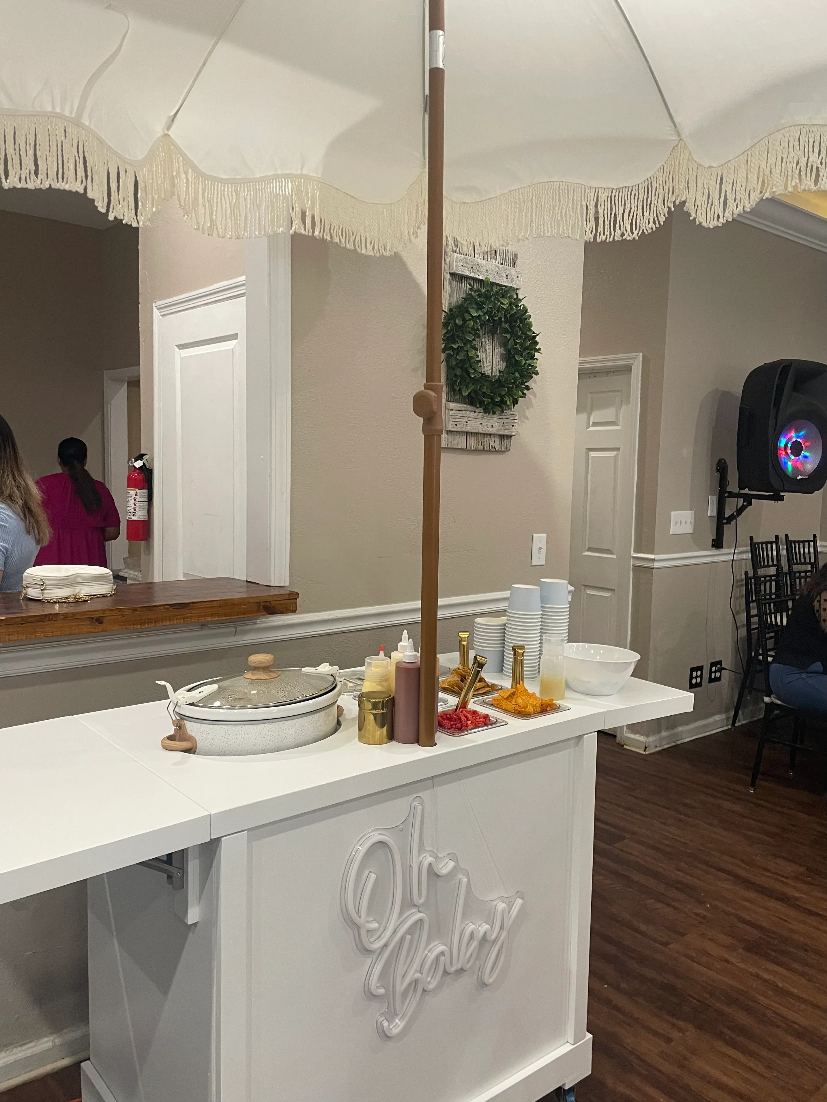 We were honored to host our Elote Cart for the very FIRST TIME at a relatives baby shower! The elote cart was personalized with an umbrella & the baby light sign.